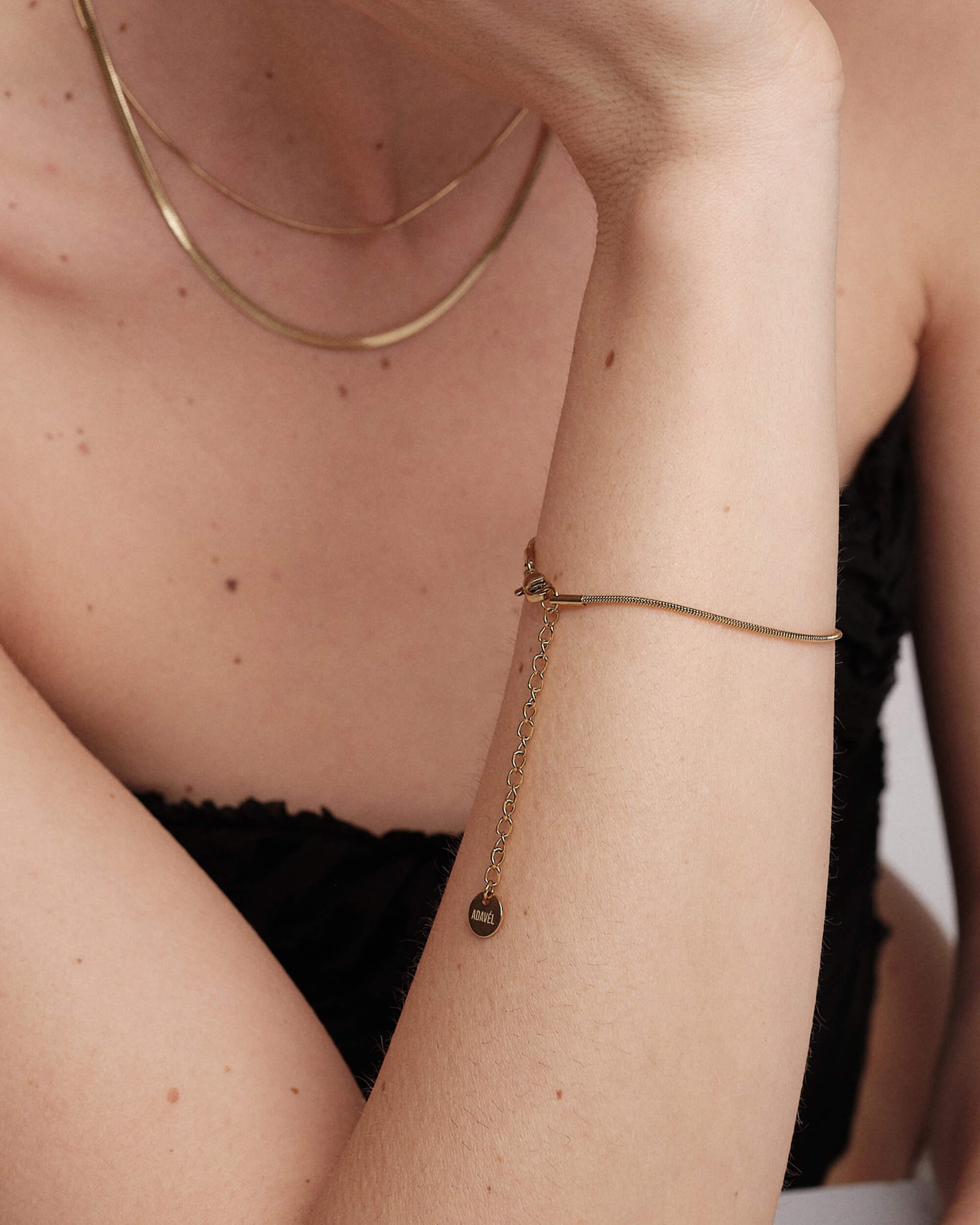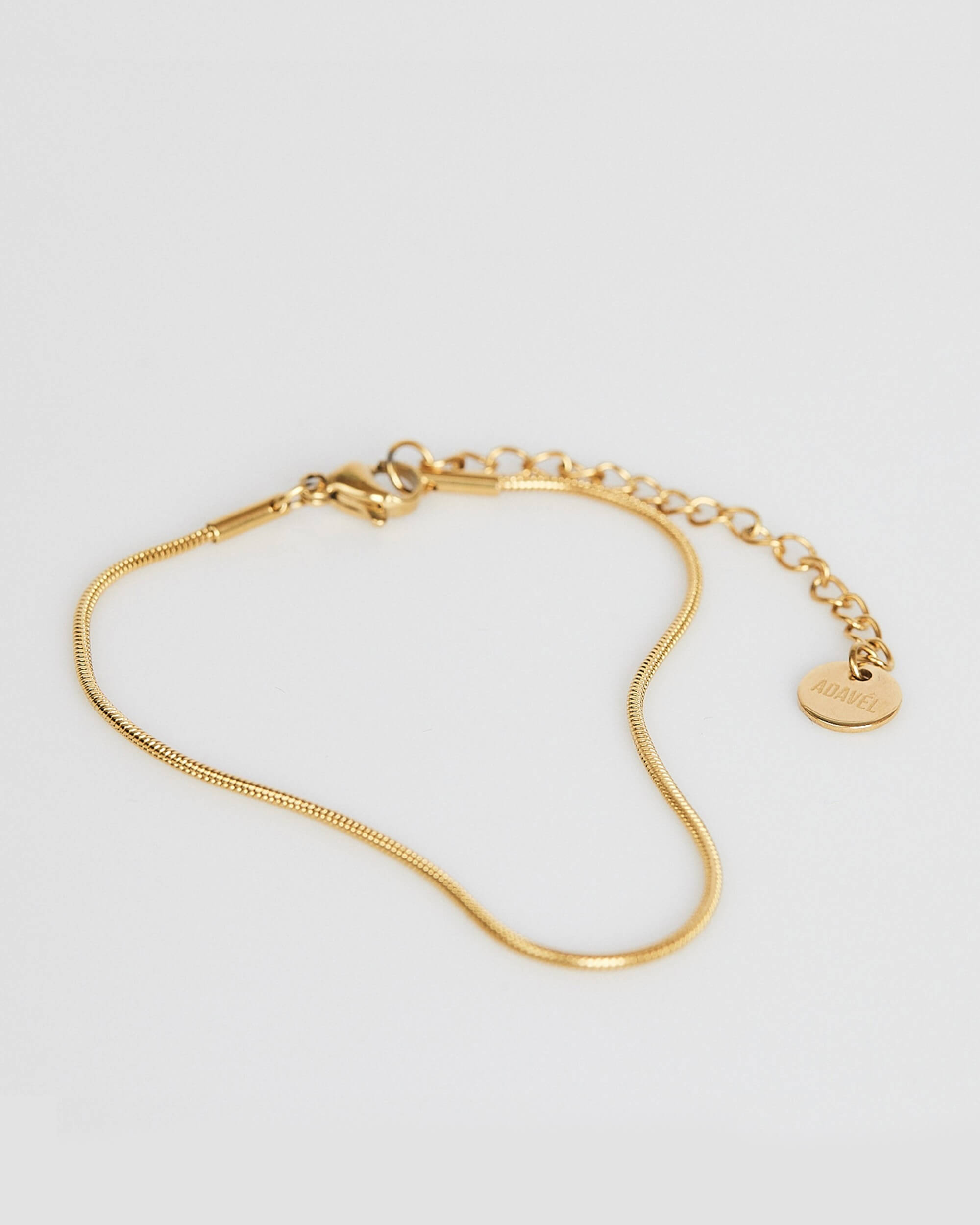 Welcome to the ADAVÉL ocean bracelet! This trendy bracelet is gold-plated and features a minimal chain with a thickness of 1.3 mm. The ADAVÉL engraved tag adds a touch of class to the bracelet, which measures 14.5cm in length with a 4cm extension.