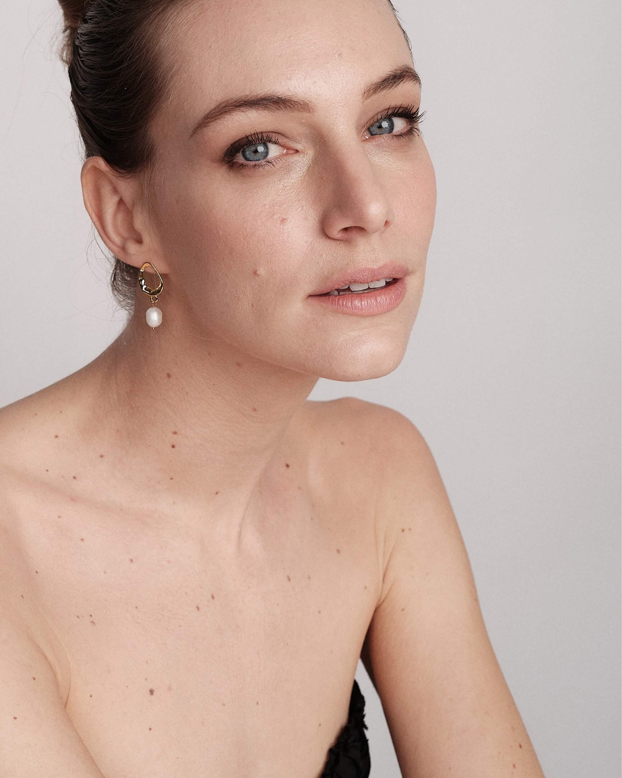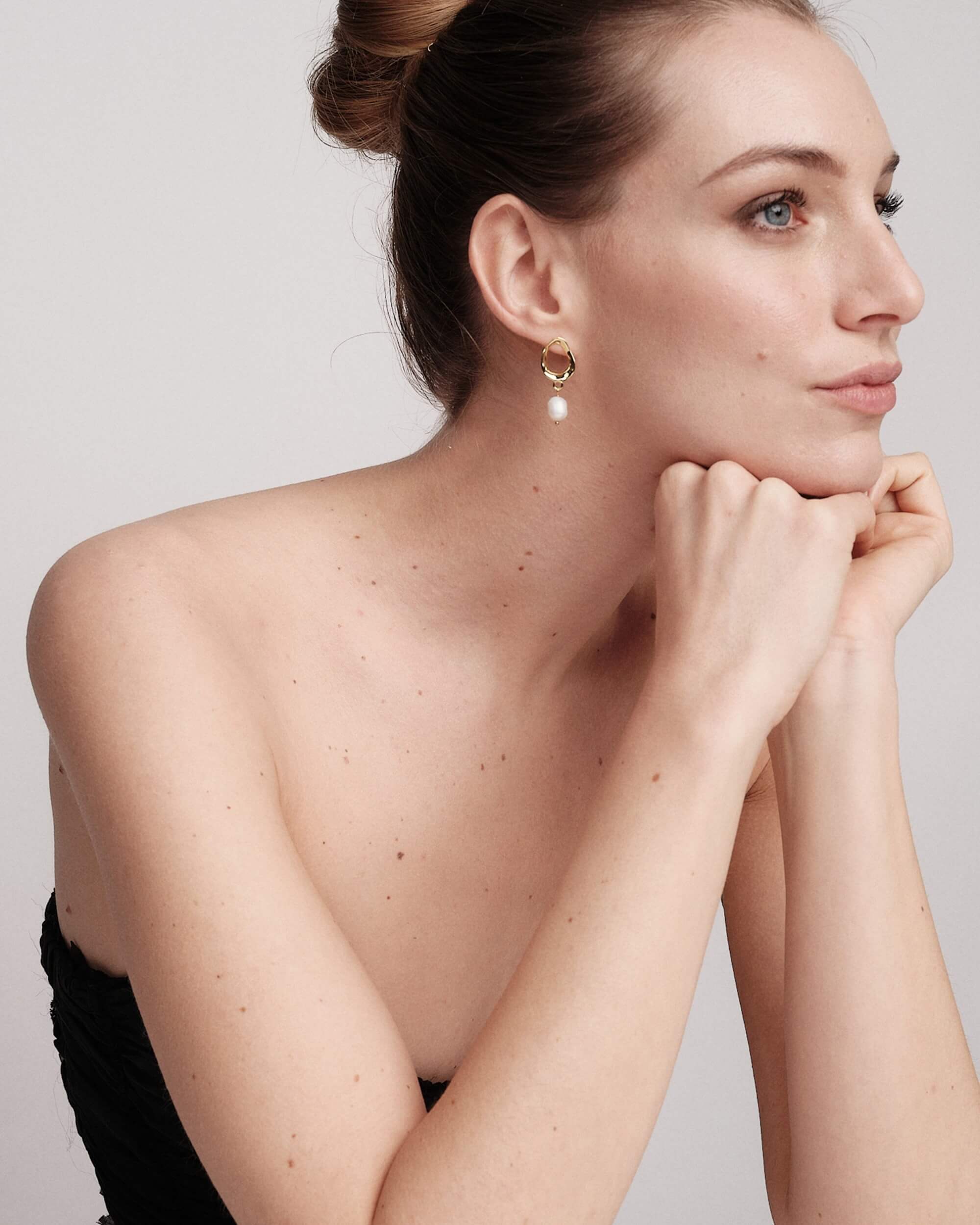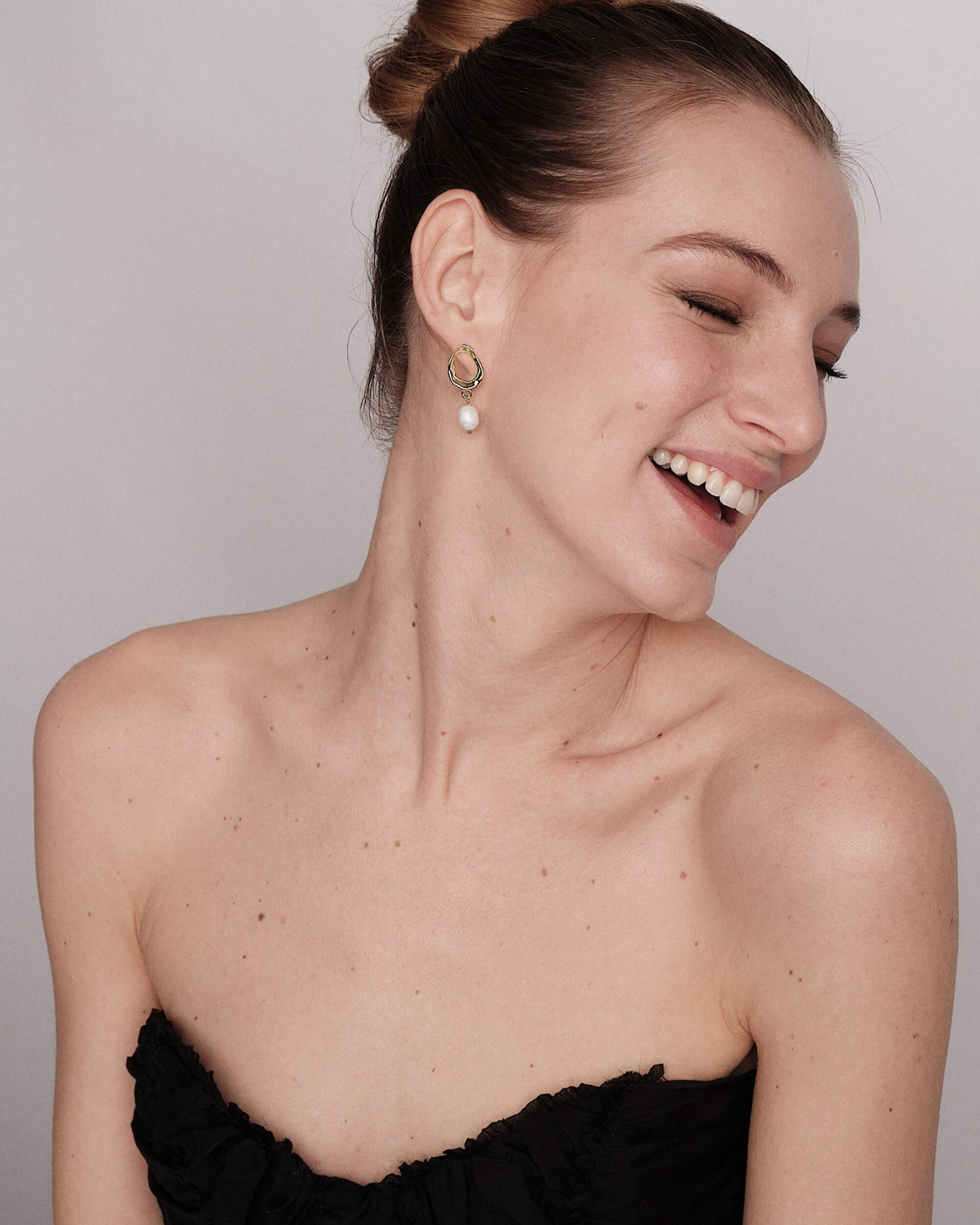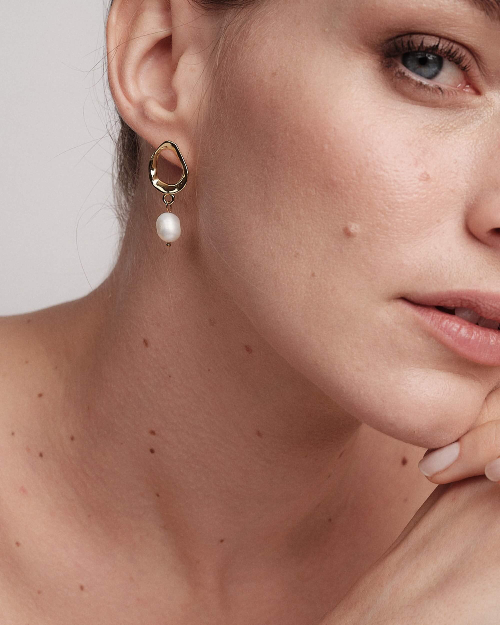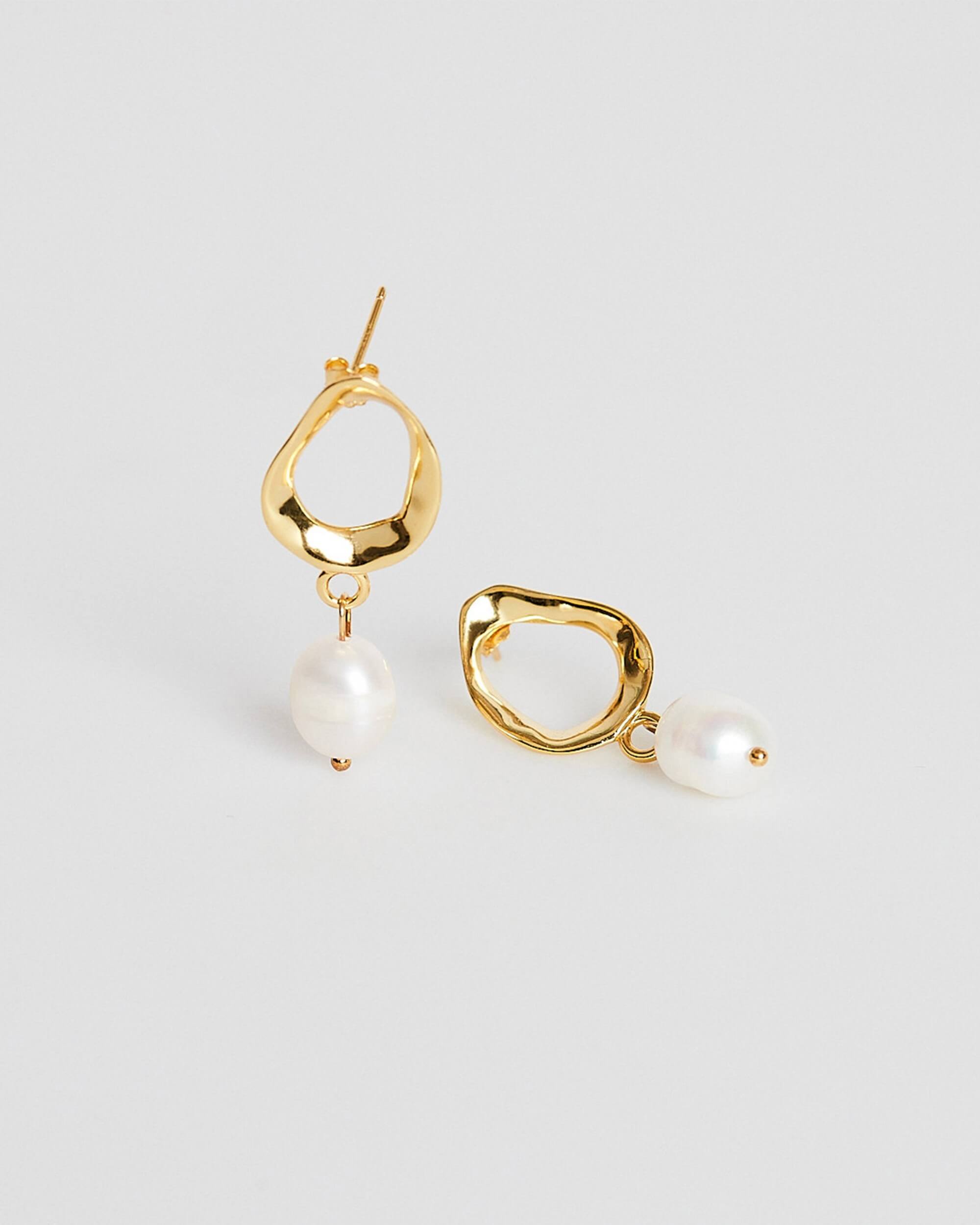 Orecchino placcato oro a forma circolare con striature geometriche.